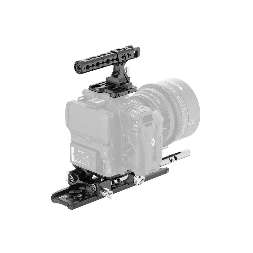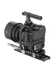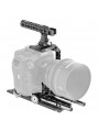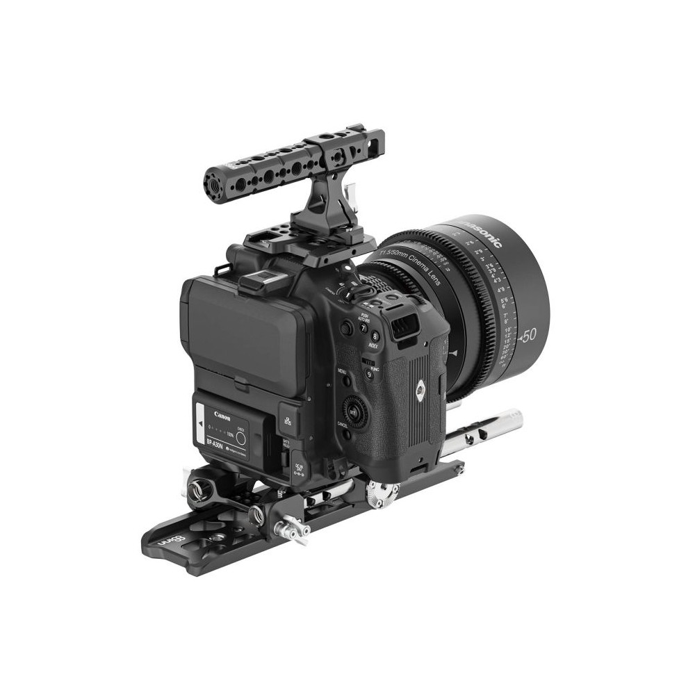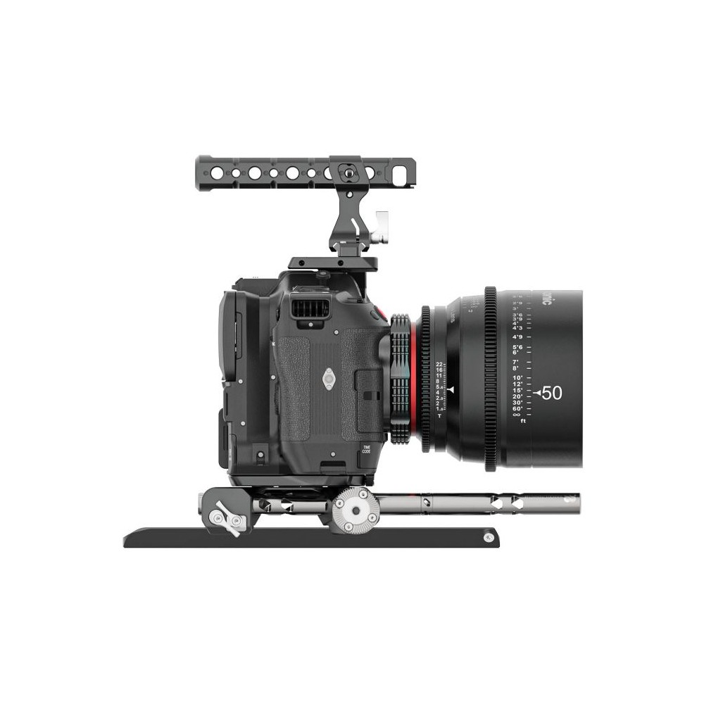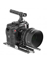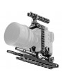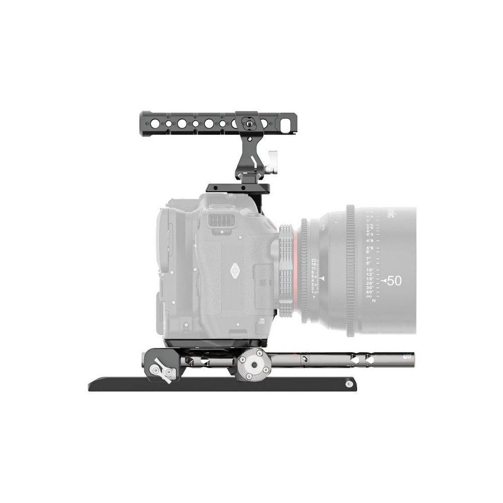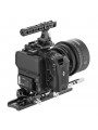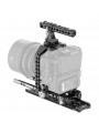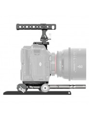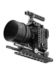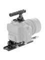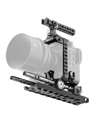 Versatile accessory kit for professional camera work includes a durable cage to secure the camera body and add accessories, a top handle for comfortable and stable handheld shooting, a dovetail plate for easy and fast mounting on tripods and the Arri compatible baseplate for stability and balance. The set is compatible with 15mm rods for mounting accessories such as follow focus motors or matte boxes. (rods not included)