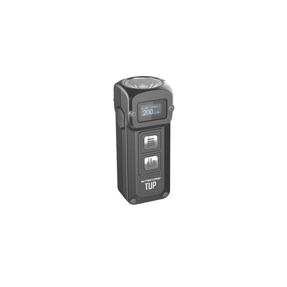 Mit der Nitecore TUP kann der Benutzer schnell zwischen 5 Helligkeitsstufen wechseln und hat außerdem direkten Zugriff auf den Turbo-Modus. Die Taschenlampe ist mit einem kleinen OLED-Display ausgestattet, das eine Reihe von wichtigen Informationen wie Helligkeitsstufe, Modus, Lumen, Batteriestatus und Laufzeit anzeigt.