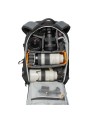 An den Seiten des Rucksacks befinden sich große elastische Taschen (für eine Flasche oder ein zusätzliches Stativ) und zwei kleinere Reißverschlusstaschen, darunter eine mit Karabinerhaken, z. B. für Schlüssel. Die abnehmbare Rückenplatte verbirgt ebenfalls mehrere Taschen - darunter ein gepolstertes Fach mit Reißverschluss für einen 14-Zoll-Laptop. Kleineres Zubehör kann in transparenten Taschen untergebracht werden, so dass es bei Bedarf leicht auffindbar ist. Auch unter dem Deckel des Rucksacks ist Platz für andere persönliche Dinge. Eine elastische Tasche am Hosenträger ist für praktische Kleinigkeiten wie eine Sonnenbrille vorgesehen.
