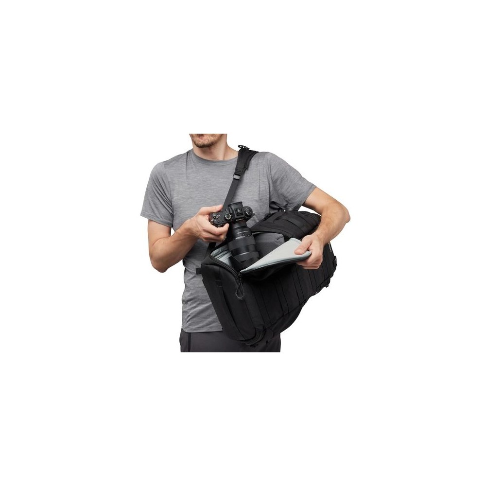 Der Rucksack passt sich vielen fotografischen Aufgaben an, nicht zuletzt dank seiner vier Zugänge. Der seitliche Schnellzugriff ermöglicht es, die Kamera herauszuziehen, ohne den Rucksack abzunehmen. Der Reißverschluss befindet sich auf beiden Seiten, was auch für Linkshänder praktisch ist. Der Zugang von oben ist ideal, wenn man mit einem langen Teleobjektiv arbeitet - hier kann man die Kamera herausnehmen, ohne den gesamten Rucksack öffnen zu müssen. Der vollständige Zugang von hinten ermöglicht eine umfassende Organisation der gesamten Ausrüstung.