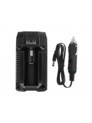 Once the battery is charged, the charger automatically stops the charging process. Green LEDs at both channels indicate the degree of charge. Two USB ports allow the charger and batteries to be used as a powerbank and charge mobile devices. A car cable allows you to use the charger while traveling.